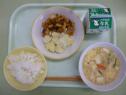 今日の給食は、ごはん、牛乳、魚と大豆のねぎソースからめ、粉ふきいも、かき玉汁です。