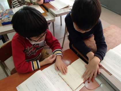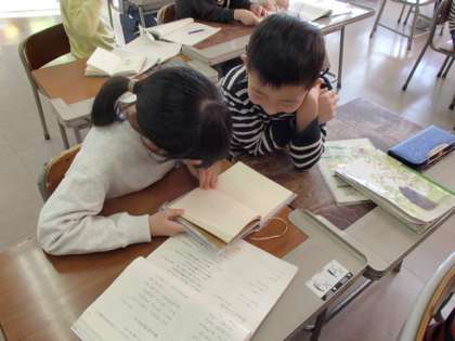 3学期最初の国語では、詩を学習しました。教科書で紹介されている詩の他にも、図書室にある本からお気に入りの詩を探しました。ペアで本を読みながら、おもしろい表現を見付けて楽しんでいました。