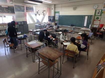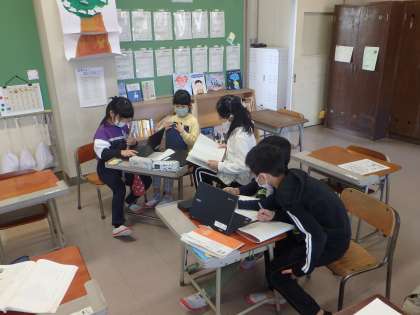 「詩のくふうを楽しもう」の学習では、見て楽しい詩、音読して楽しい詩、言葉が隠れている詩などの工夫を見付け、お気に入りの詩を探しました。一人1台端末を使ったり、学級文庫にある本を見たりしながらお気に入りの詩を視写しました。