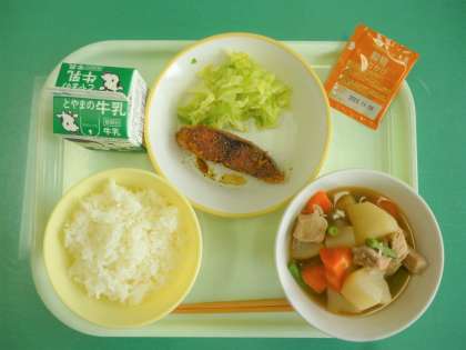 今日の給食は、ごはん、牛乳、魚のえごまだれ、ゆでキャベツ、大根と豚肉の煮込み、穀物ふりかけです。