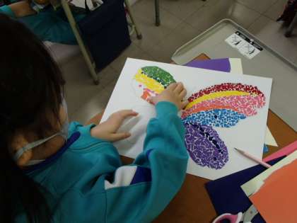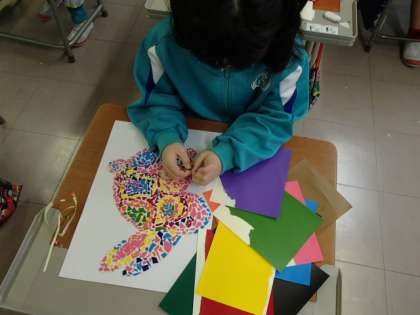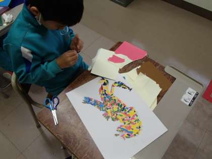 子供たちが思い思いに描いた生き物に、色合いを考えながらカラフルなシールを貼っています。完成が待ち遠しいです。