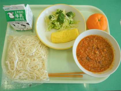 今日の給食は、ソフト麺のミートソース、牛乳、卵ロール、グリーンサラダ、みかんです。