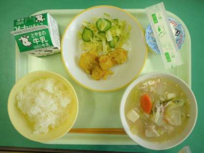 今日の給食は、ごはん、牛乳、ちくわのカレー揚げ、あわせ和え、豆乳汁、ヨーグルトです。