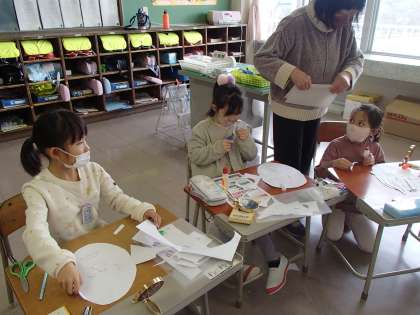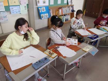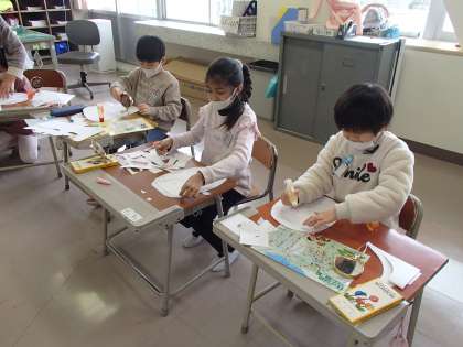 図工の学習で紙版画にチャレンジしています。自分の顔を鏡でじっくりと見ながら、目や眉、鼻等のパーツをつくり、顔となる台紙に貼りました。刷ってみるまでどのような作品になるかは分かりませんが、ドキドキわくわくです。
