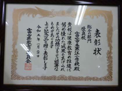 1月20日(金)に本校が富山県教育委員会より2022年度の総合の部門の健康教育実践優良校として表彰されました。子供たちが毎日健康で過ごし、休まずに登校していたことが認められたものです。これからも、健康教育を実践し、子供たちが元気に過ごせる学校づくりを目指していきたいと思います。