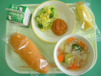今日の給食は、コッペパン、牛乳、メンチカツ、ブロッコリーサラダ、白菜スープ、バナナです。