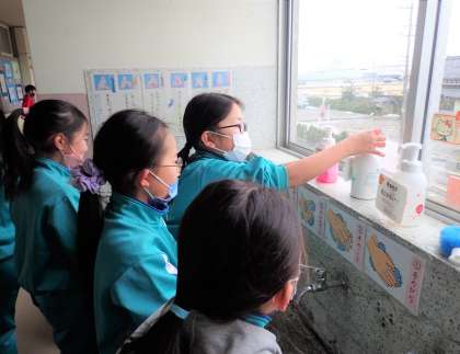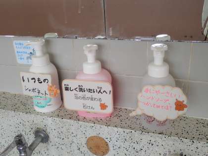 すこやか委員会では石けんの種類を増やし、自分の好みの石けんを選べるようにしました。また、ポップを付け、石けんの特徴がよく分かるようにしてあります。まだまだ水は冷たいですが、手洗いを楽しんでほしいと思います。