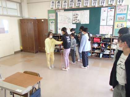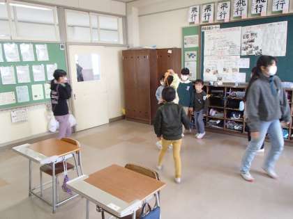 今日は、休み時間にクラスみんなでしっぽとりをして遊んでいました。また、げんきタイムには、1年生が何人か遊びに来たので、一緒に縄跳びをしていました。