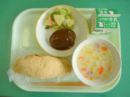 今日の給食は、揚げパン、ハンバーグのケチャップ煮、白菜とりんごのサラダ、コーンチャウダーです。卒業お祝い献立でした。