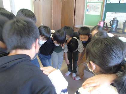 上の写真は、大会前に、教室で円陣を組んで、気合いを入れている様子です。