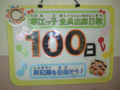 本日、全員出席100日を達成することができました。今年度はコロナ禍が続いており、コロナ感染症を含め、発熱の場合や検査等の場合も欠席扱いにはなっていません。