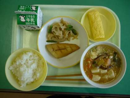 今日の給食は、ごはん、牛乳、鰆の西京焼き、れんこんのきんぴら、えびと豆腐のうま煮です。