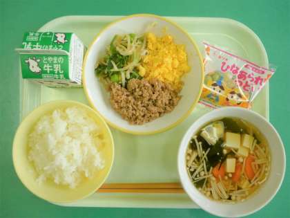 今日の給食は、そぼろ丼(豚そぼろ、炒り卵)、牛乳、なばなひたし、すまし汁、ひなあられです。ひなまつり献立でした。