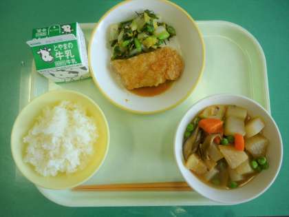 今日の給食は、ごはん、牛乳、揚げ魚のレモン味、昆布和え、大和煮です。