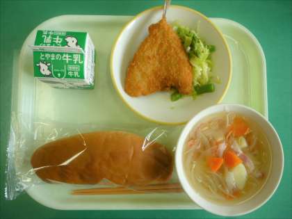今日の給食は、コッペパン、牛乳、あじフライ、アスパラサラダ、ポテトスープです。