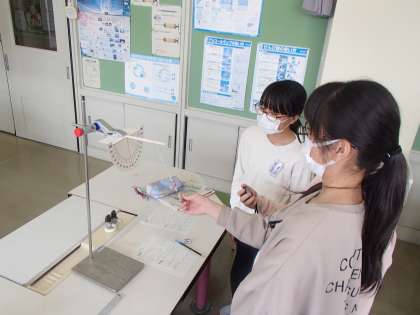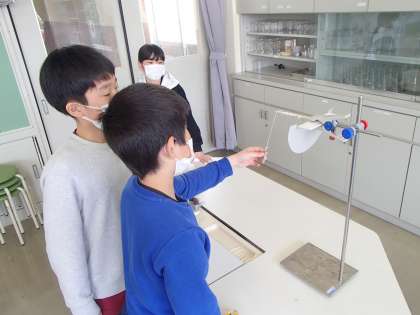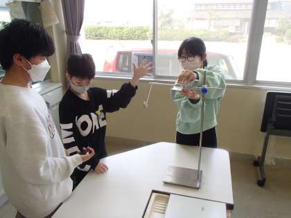 理科の学習では、ふりこのきまりについて学習しています。条件を変えながら実験をし、ふりこが1往復するまでの時間は何によって変わるのかを調べています。