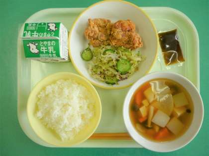 今日の給食は、ごはん、牛乳、鶏肉の竜田揚げ、ゆかり和え、けんちん汁、のり佃煮です。