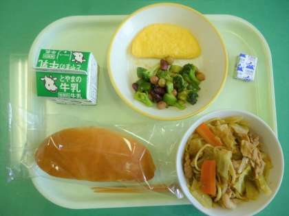 今日の給食は、コッペパン、牛乳、焼きそば、オムレツ、ビーンズサラダ、ポケットチーズです。