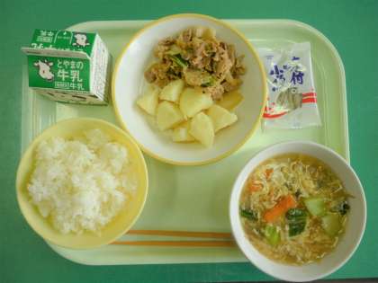 今日の給食は、ごはん、牛乳、豚肉のキムチ炒め、粉ふきいも、中華かき玉汁、味付け小魚です。今年度最後の給食でした。調理員の方々、一年間おいしい給食をありがとうございました。