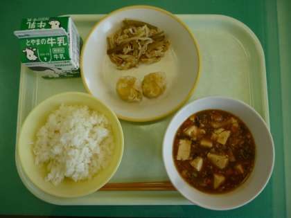 今年度最初の給食です。今日の給食は、ごはん、牛乳、にんじんシューマイ、茎わかめのチョナムル、マーボー豆腐です。