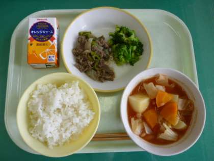 今日の給食は、ごはん、オレンジジュース、アメリカンビーフソテー、そえ野菜、白インゲン豆のトマト煮です。