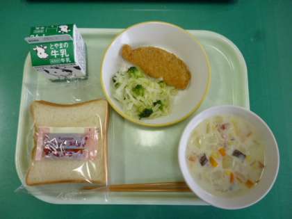 今日の給食は、食パン、牛乳、サーモンフライ、ブロッコリーサラダ、クリームチャウダー、メープルジャムです。