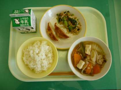 今日の給食は、ごはん、牛乳、焼きぎょうざ、いり大豆和え、肉豆腐です。