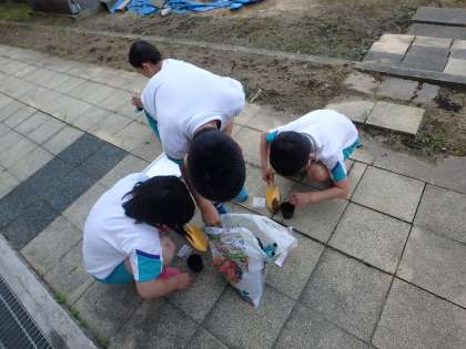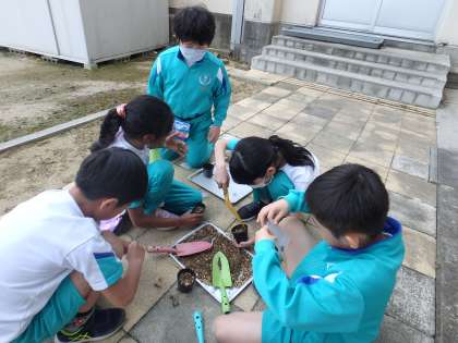理科の学習では、じっくり観察したホウセンカの種をまきました。今から成長するのが楽しみですね。