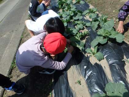 理科の学習で、チョウの育ち方について学習をします。2年生の時に植えたキャベツ畑に行き、チョウの卵や幼虫を見付けました。