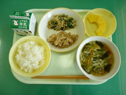今日の給食は、ごはん、牛乳、豚肉のしょうが焼き、ナムル、中華スープ、パインアップルです。