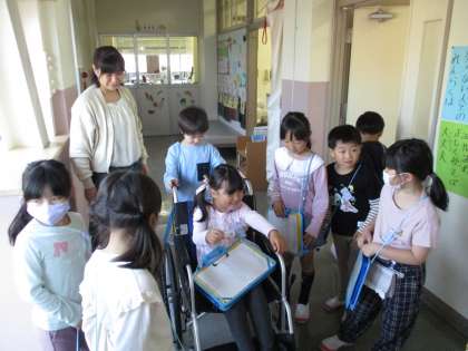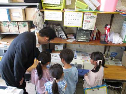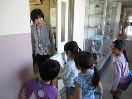生活科の学習で、学校探検をしました。校長室や放送室、保健室等に、どきどきしながら「1年の○○です。はいってもいいですか。」と言って、入らせてもらいました。今まで気になっていたけれど入れなかった部屋にも入ることがでいて、大満足の1年生でした。