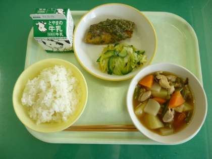 今日の給食は、ごはん、牛乳、魚の磯辺揚げ、あわせ和え、筑前だきです。