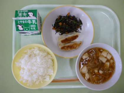 今日の給食は、ごはん、牛乳、豆腐の野菜あんかけ、焼きぎょうざ、ひじきのごま和えです。