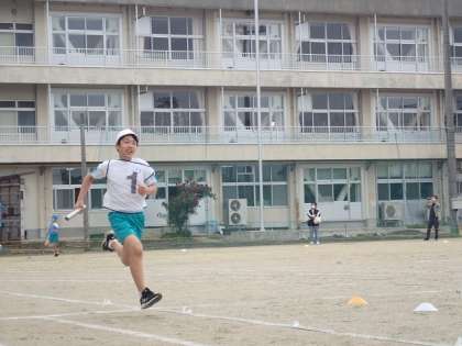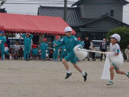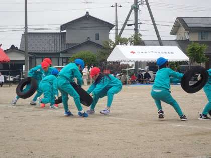中学年によるぐるぐるタイフーン(台風の目)や寒江ヶ原の戦い2023(タイヤ引き)、色別選手リレーも行いました。