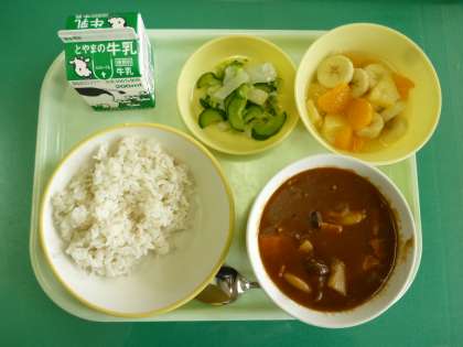 今日の給食は、麦ごはん、牛乳、たべキリンハヤシ、はくさいサラダ、フルーツミックスです。
