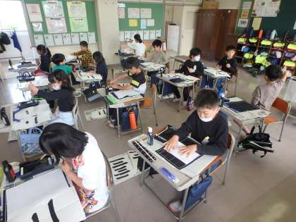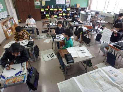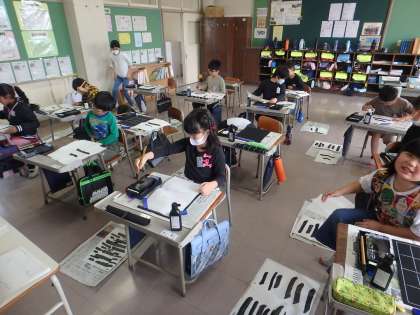3年生は毛筆で「二」という字を書きました。筆の角度や文字のバランス等、自分でよくしたいところを見付け、集中して書いていました。