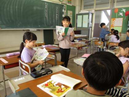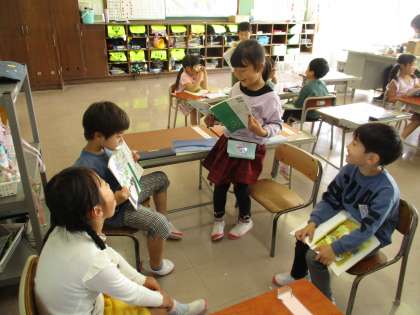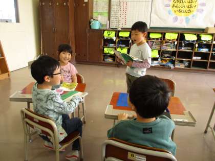 国語では、「はなのみち」の音読を練習しています。くまさんになりきって、驚いた振り付けをしながら読む子、春の暖かさを表現するために優しい声でゆっくり読む子など、一人一人の工夫がとても素敵でした。