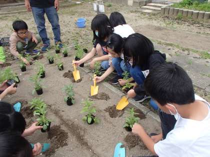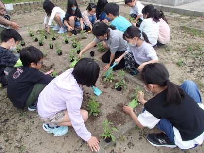 みんなで協力して花の苗を植えました。「チョキの指ではさんで持つよ」「優しく土をかぶせるんだったよね」と知っていることをお互いに教え合っていました。きれいに育つとよいですね。