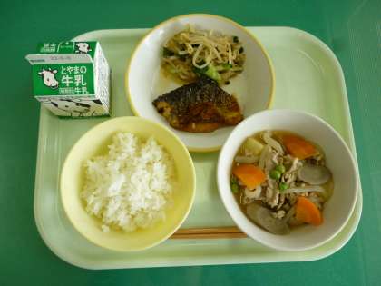今日の給食は、ごはん、牛乳、さばの塩焼き、香味和え、豚肉の南蛮煮です。