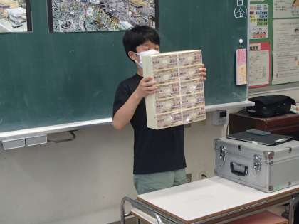 今日は税務署の方に来校していただいて租税教室を実施しました。もし税金が無い世界だったらどうなるかを考えることを通して税金の使い道や重要性について学習しました。また、最後には1億円のレプリカを持たせていただくなど、貴重な1日になりました。