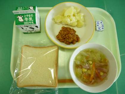 今日の給食は、食パン、牛乳、チリコンカン、こふきいも、キャベツスープ、ポケットチーズです。