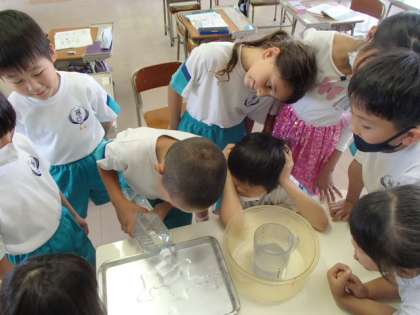 算数の時間には、水のかさの学習をしています。1Lが10dLであることを、実際にみんなで確かめました。