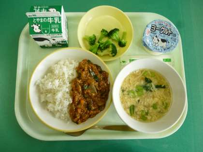 今日の給食は、麦ごはん、牛乳、もりもりマーボー丼、ゆでブロッコリー、かきたま汁、ヨーグルトです。