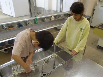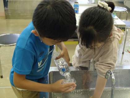 今日の算数では、学習した水のかさの単位を使って、いろいろな入れ物の水のかさを調べました。