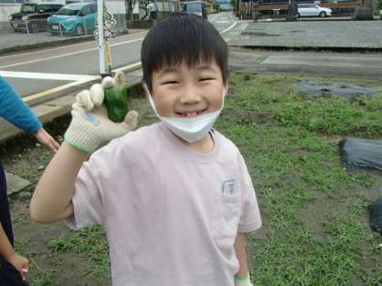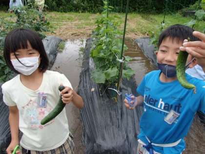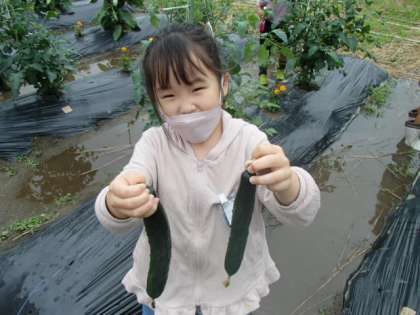雨の日が2日ほど続いたため、雨がやんでいる間に久しぶりに野菜を見に行きました。実が生長した4名が、初めての収穫をすることができました。とても嬉しそうでした。