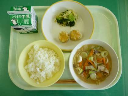 今日の給食は、ごはん、牛乳、にんじんシューマイ、しょうがひたし、とんこつラーメンです。