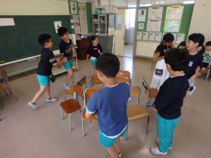 休み時間に、係活動の様々な企画が行われています。今日は、ゲーム係のいす取りゲームと運動係のドッジボールを行いました。
