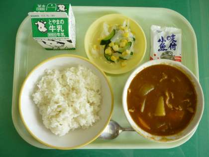 今日の給食は、ごはん、牛乳、カレーライス、大根サラダ、味付け小魚です。