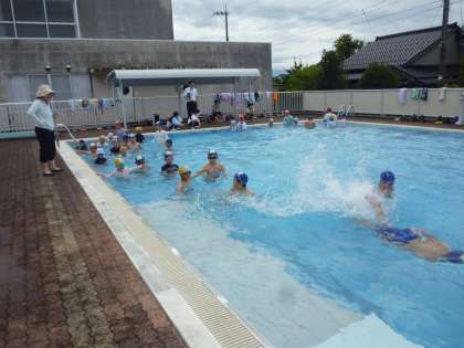 環境・スポーツ委員からの話や代表児童の挨拶、5、6年生の模範泳法がありました。