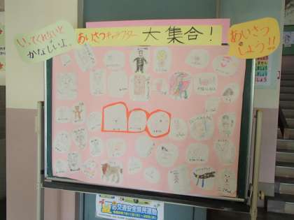 また、玄関に寒江っ子が描いてくれたあいさつキャラクターが大集合しています。一人一人がキャラクターを作ったときの、思いや願いを思い出しながら、あいさつを広げていってほしいと思います。